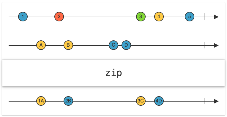 - 두 Observable 값들을 순서대로 쌍으로 결합하여 방출하며 순서가 보장됨