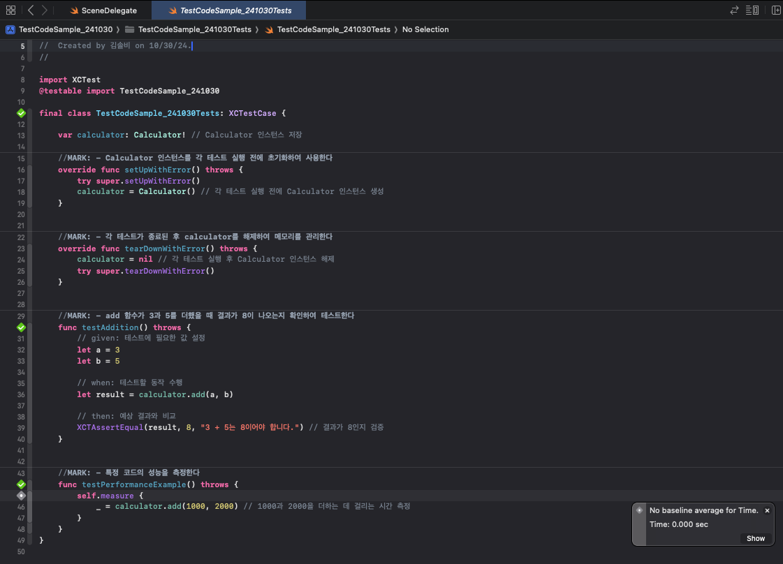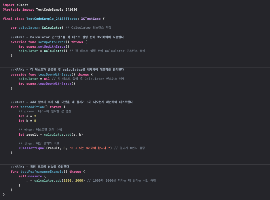 - testPerformanceExample() : 성능 테스트 예제 함수