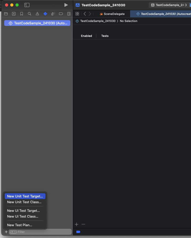 추후 프로젝트에 추가 시에는 네비게이션 바 - 6번째 탭 - 좌측 하단의 "+" - New Unit Test Target