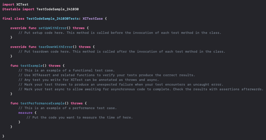 - setUpWithError(),tearDownWithError() : 각 테스트가 실행되기 전과 후에 호출된다. 테스트 환경을 초기화하거나 해제하는 코드가 들어갈 수 있다