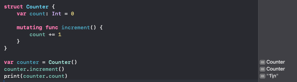 mutating 키워드를 사용하게 되면 self를 변경할 수 있는 메서드가 되어 count 프로퍼티를 수정할 수 있다